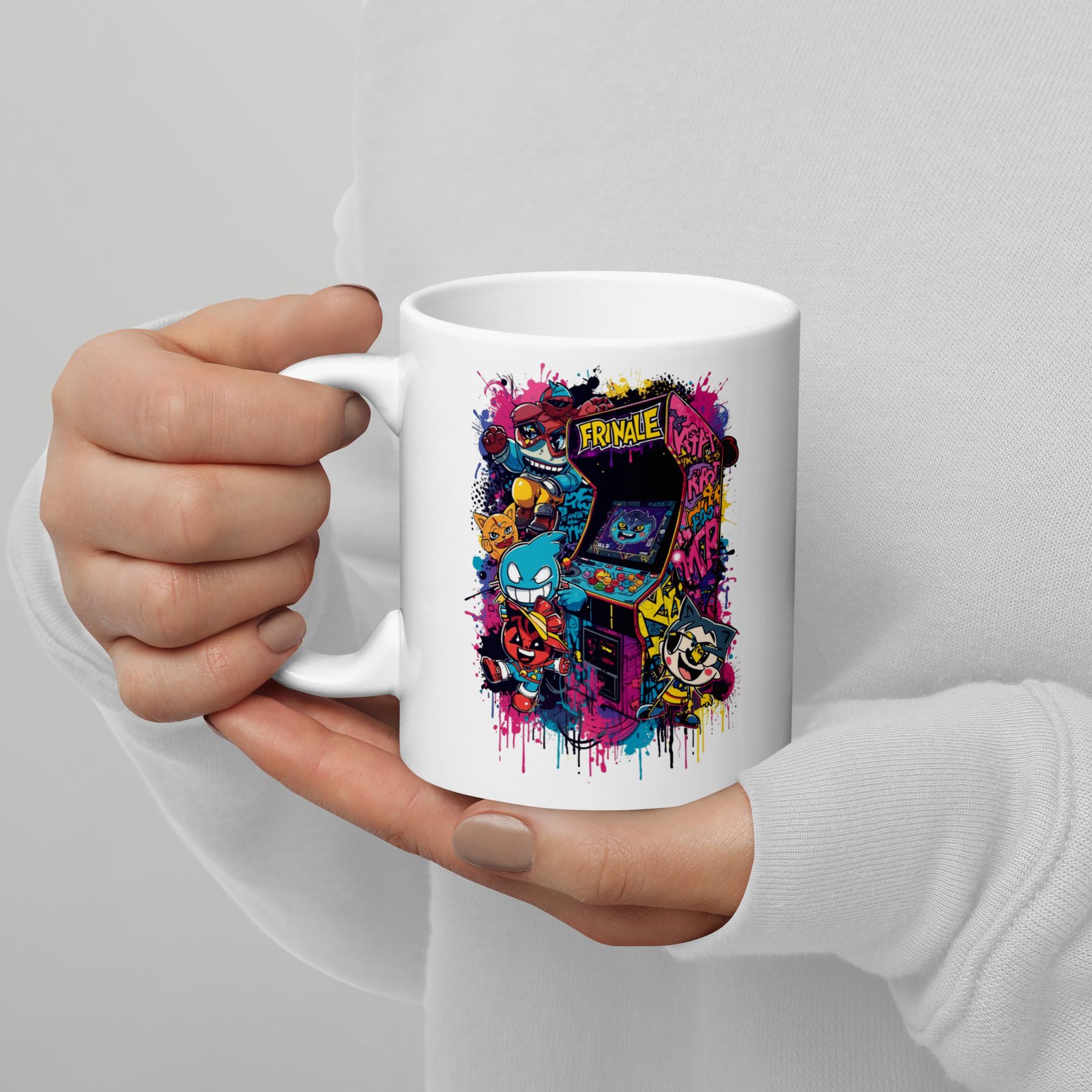 This vibrant 80s-inspired mug bursts with retro arcade energy. Featuring a graffiti-style design, it showcases a colorful arcade cabinet surrounded by playful cartoon characters with bold expressions and dynamic poses. Splashes of neon pink, blue, yellow, and purple paint create a chaotic street-art vibe, making the artwork feel alive and full of movement. Perfect for gamers and retro lovers, this mug captures the nostalgia of classic arcades mixed with a modern urban twist.