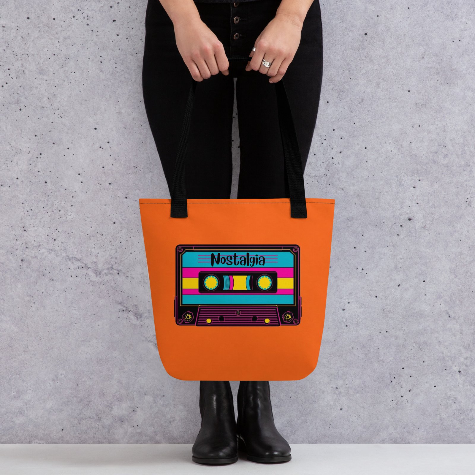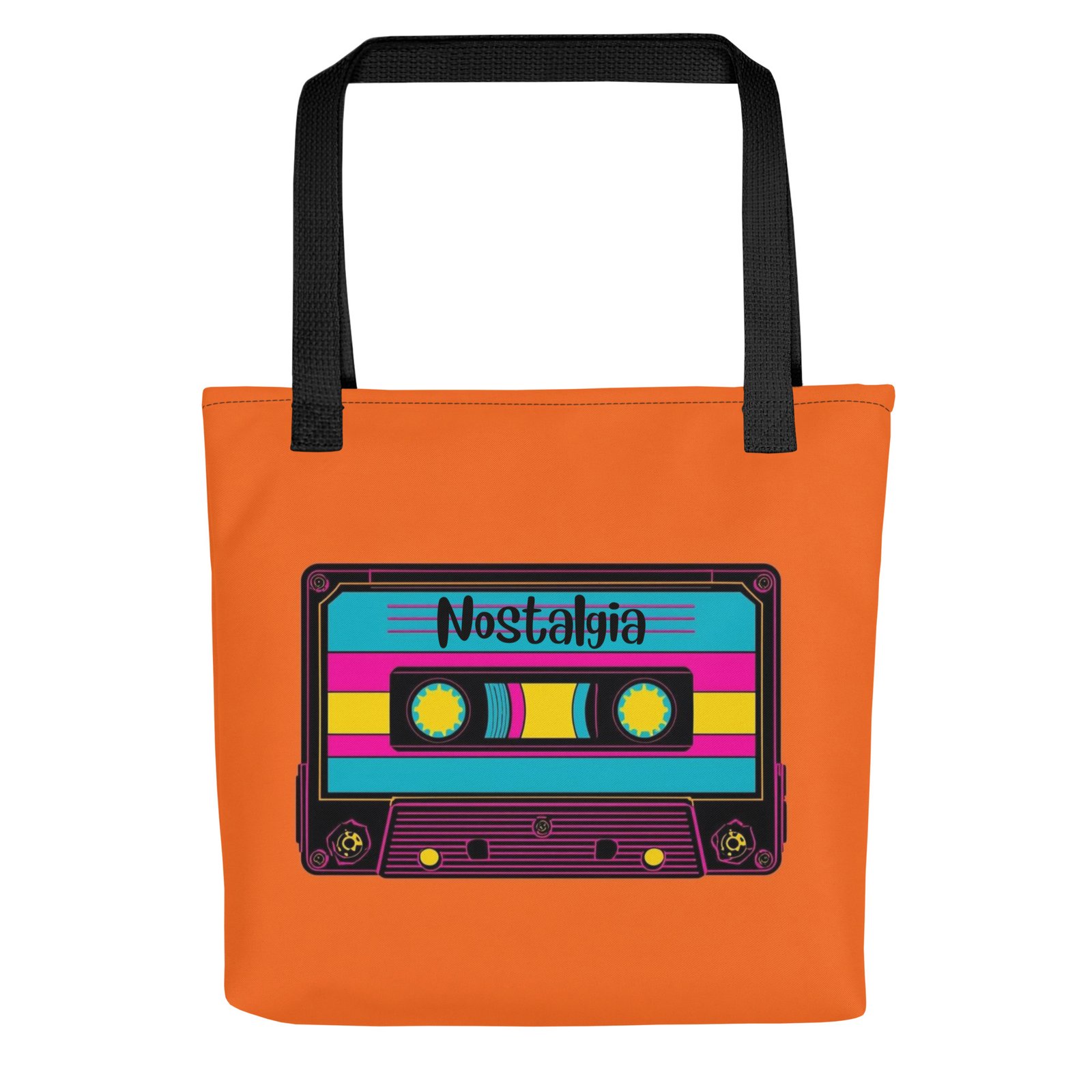 Take a trip back to the golden era of mixtapes with this bold 80s-inspired tote bag. Featuring a colorful retro cassette against a vibrant orange background with the word Nostalgia written across it, this design captures the DIY spirit and playful energy of the decade. Made from durable, eco-friendly materials with sturdy handles, it’s perfect for everyday use—whether for shopping, school, or carrying your essentials. A stylish accessory for music lovers, vintage fans, and anyone who wants to add a touch of retro flair to their look.