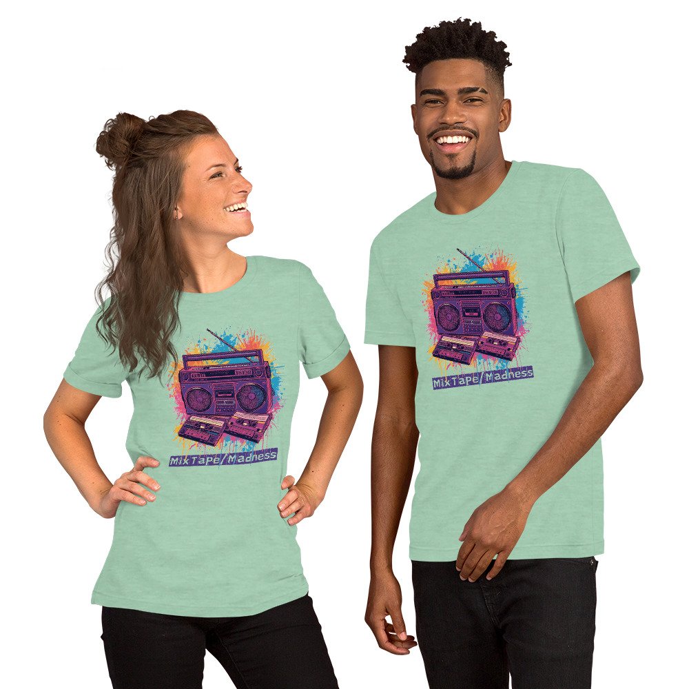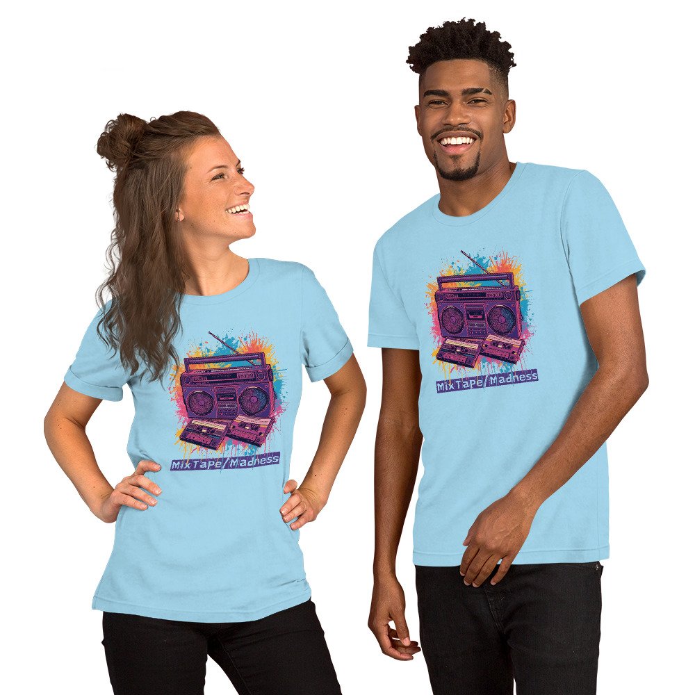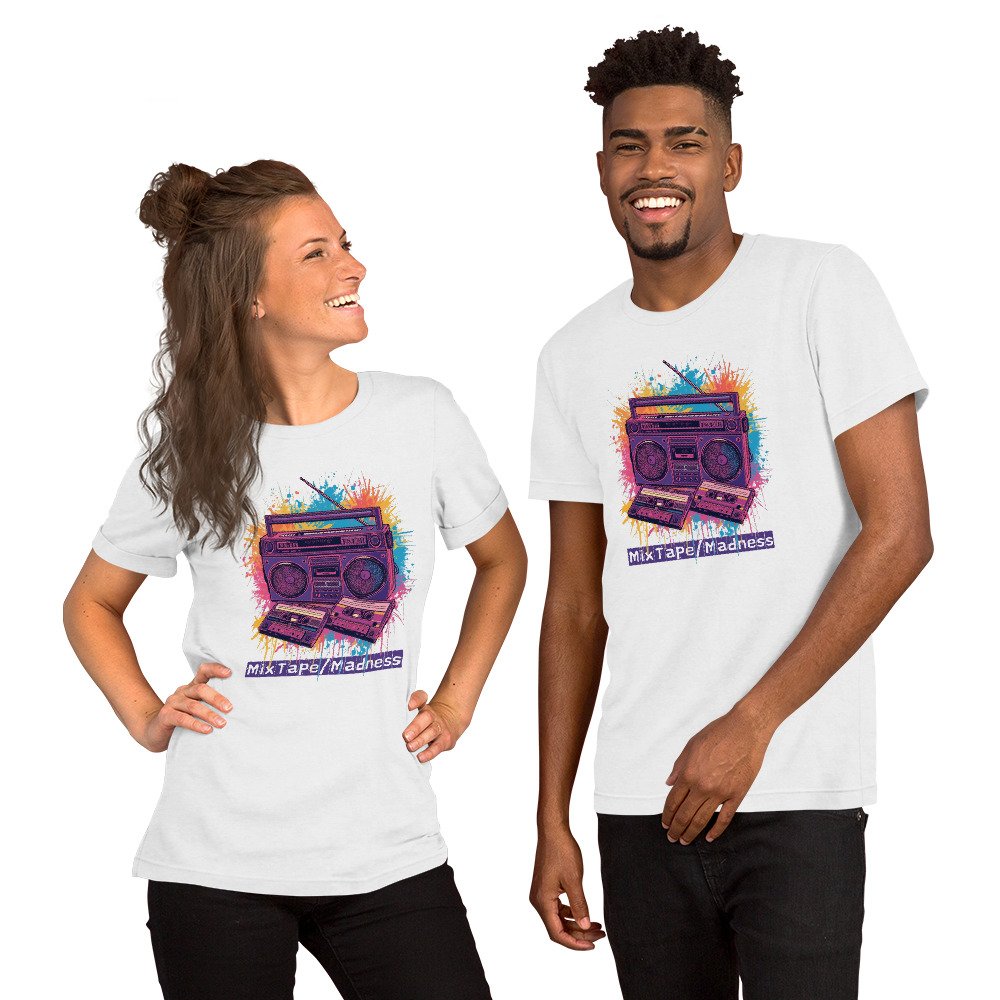 Cassette chaos never looked so good. A retro boombox surrounded by vibrant splashes and “Mixtape Madness” text—this tee is pure 80s audio nostalgia